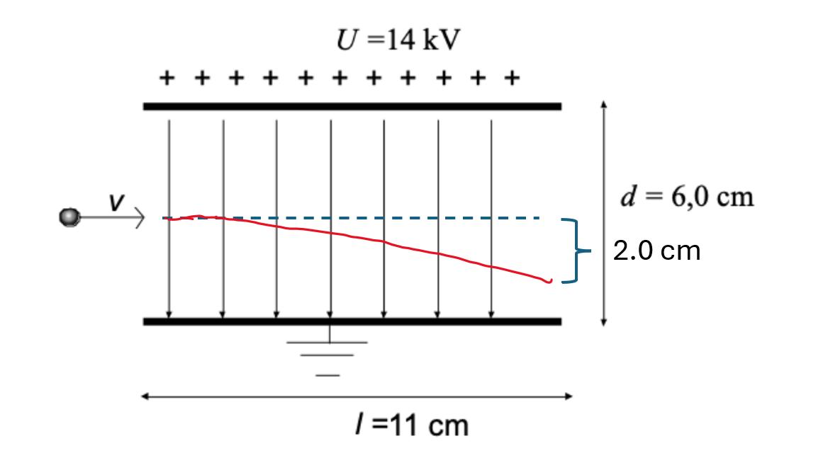 Du ser att en kvalitativ beskrivning av vad som händer med elektronen är ett streck i figuren, rakt upp i plattan så snart elektionen kommit in i fältet. Eller hur?