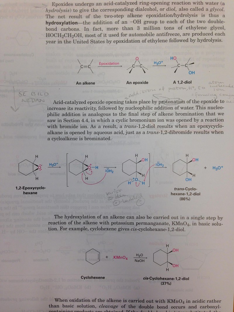 Jag har svårt att skriva en bra förklaring utan en massa bilder, som jag tyvärr inte hinner göra just nu. Men bara ett litet tips: Rita en egen version av mittenbilden där du skriver ut kolatomerna närmast epoxidbindningen med C, och skriver alla bindningar som elektronpar i stället (dvs Lewisstrukturer). Då kan det nog klarna lite.