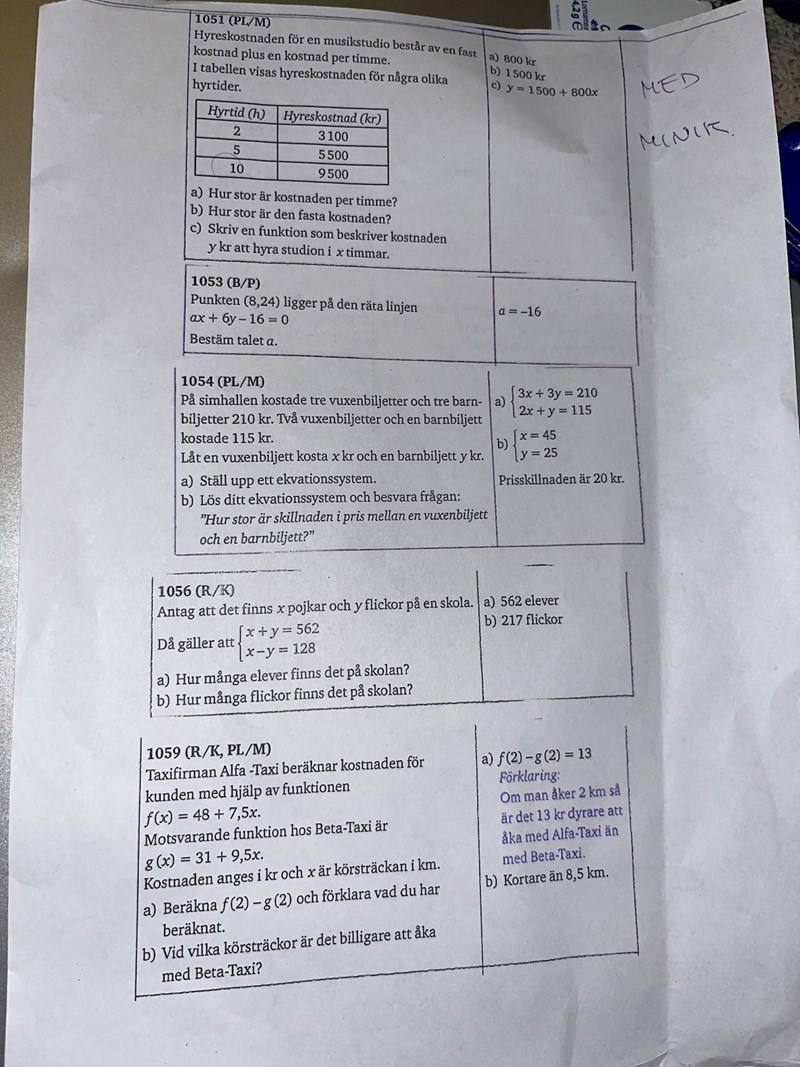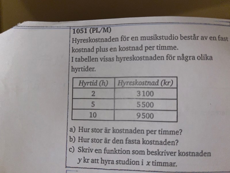 Du är på rätt spår. Om du har kommit till 3100=1600+m, har du ett steg kvar. Du ska få den fasta kostnaden, i det här fallet m=...