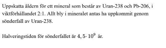 Hej! Jag har fastnat på en uppgift inom kärnfysik där man ska bestäma åldern på ett mineral. En stegvis förklaring skulle uppskattas enormt eftersom att jag har försökt lös uppgiften på flera olika sätt nu och kommer fortfarande inte fram till en lösning.