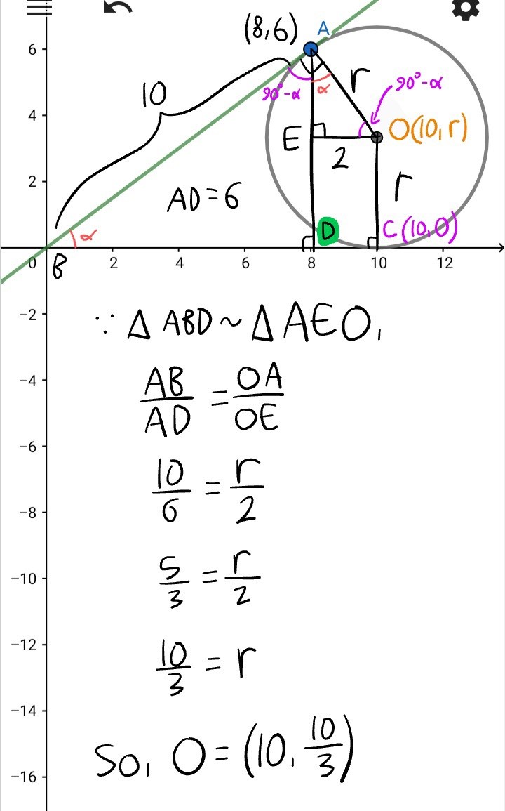 Om jag löste den här uppgiften skulle jag använda mig av att linjen AO har lutningen -4/3 eftersom den är vinkelrät mot AB, och utnyttja att det är lika långt från A till O (med koordinaterna k,r) som mellan O och C (med koordinatena (k,0) och att det avståndet är r.