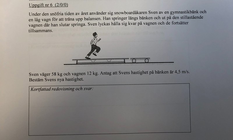 Asså du kan kolla i den blåa boken och kolla på sida 35 och få ut formeln m*v0 + M* u0 = m*v + M* u ...förenkla till m*v0 + M* u0 = (m+M)v