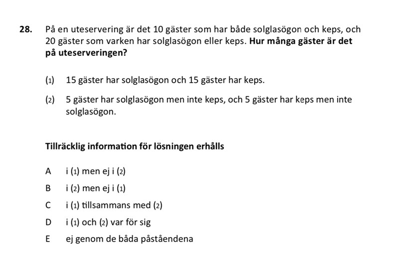 2: 5 har endast solglasögon, 5 har endast keps, 10 har både och, 20 har inget. 5+5+10+20=40.