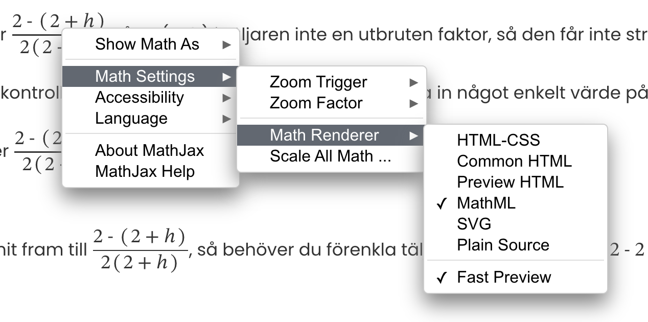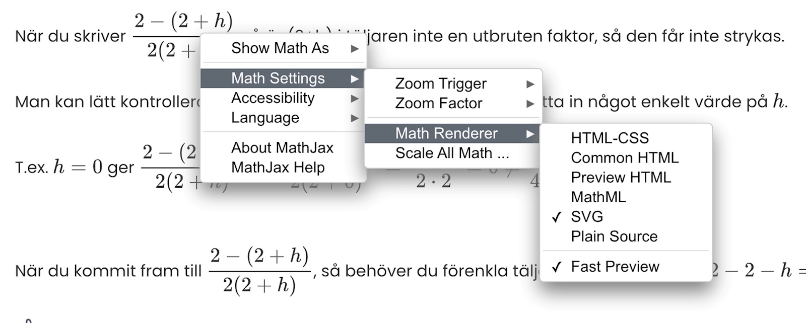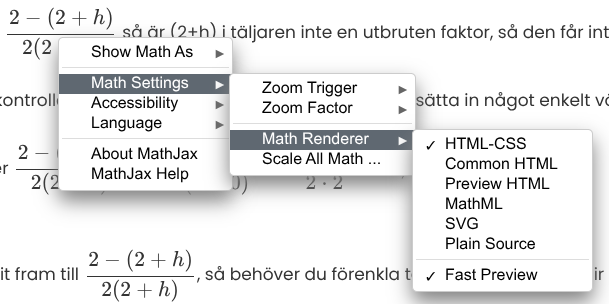 Testa att ändra inställningarna (höger klicka på ett matematiskt uttryck):