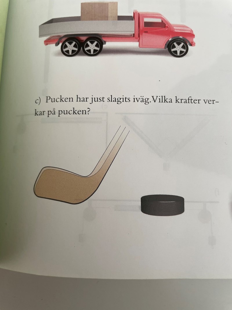 Uppgiften är att man ska rita ut krafterna på pucken som just har slagits iväg. Men jag fattar inte varför det inte finns någon kraft som går åt det hållet pucken åker åt.