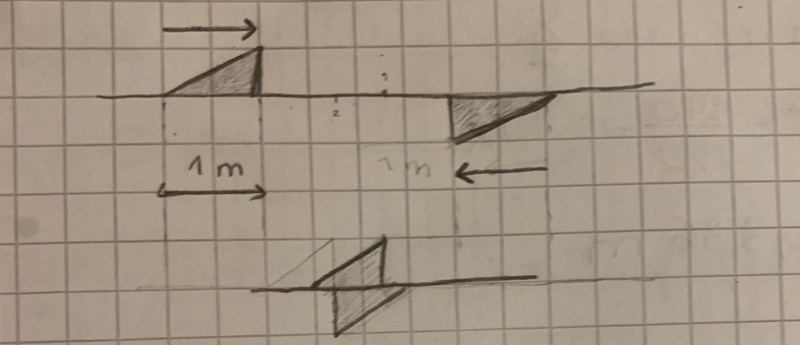 två pulser utbreder sig i motsatta riktningar. Hur ser de ut 1,5 s senare? 2 rutor är 1 meter och hastigheten är 1 m/s.