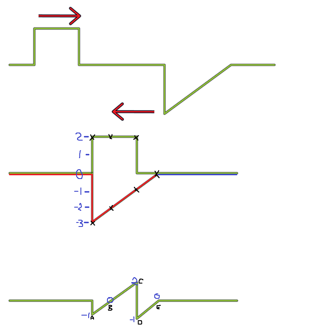 - Vid D (omedelbart efter C) är den gröna 0 och den röda -1: 0+(-1)=-1Är inte den gröna 2 här?