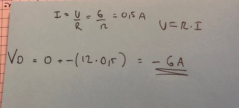 För c och D så blir det positivt 6 men jag får det till negativt 6. Om jag exempelvis går från vänster sida från jordningen så måste vi gå igenom 12 ohm så jag beräknade ut I.