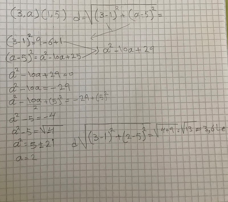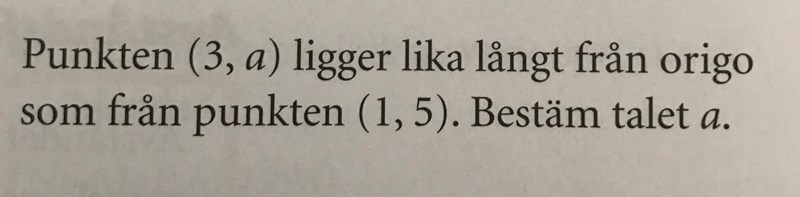 Punkten (3,a) ligger lika långt från origo som från punkten(1,5).