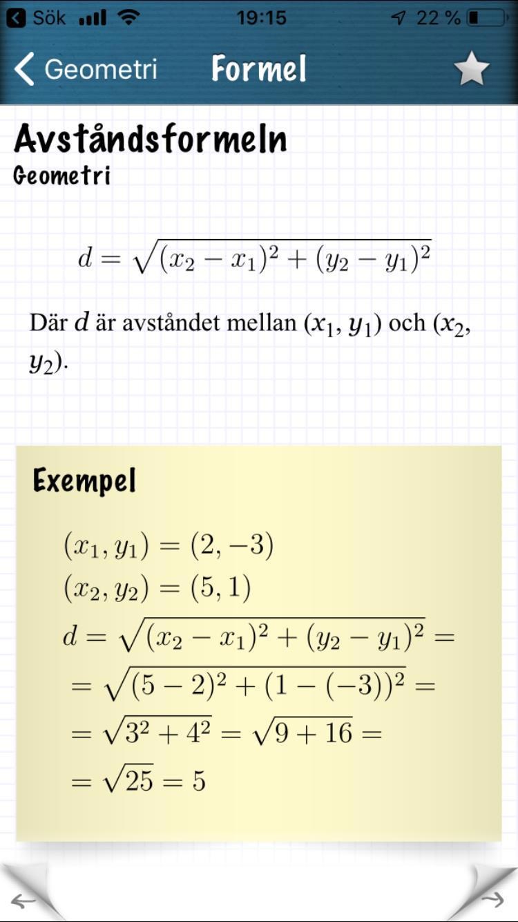 - Avståndet från origo, dvs punkten (0; 0), till punkten (1; 5) är enligt avståndsformeln .