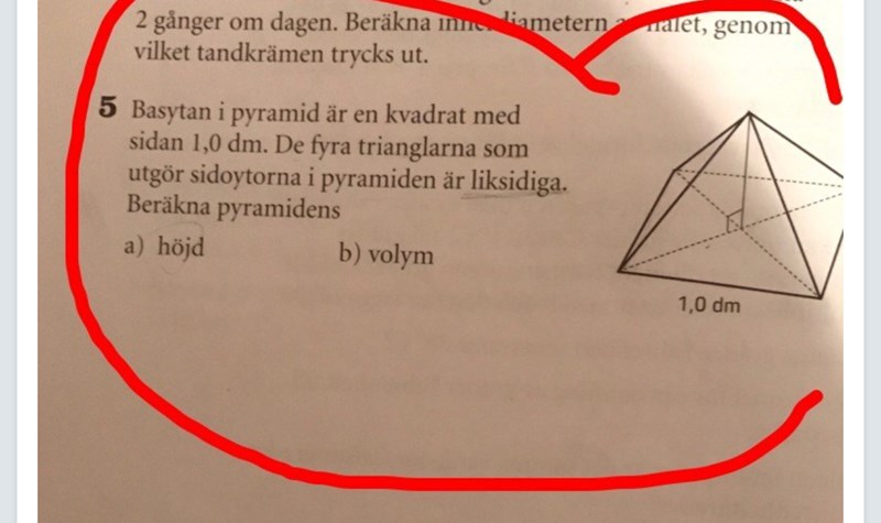 Jag vet faktiskt inte hur röda sidan kan vara 1dm. Derkänns konstigt eftersom det bara är basytans sidor som är 1dm. Har inte lyckats lösa ut hypotenusa (röda sidan)