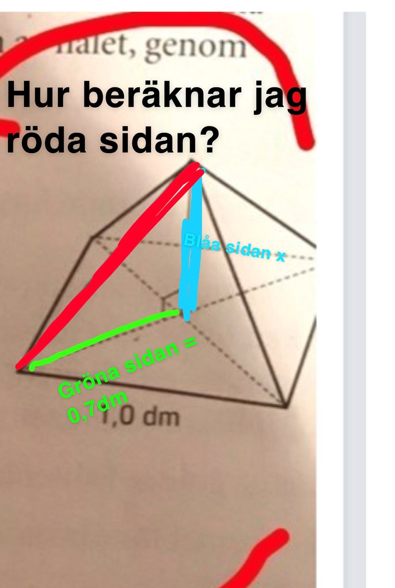 Du vet hur lång den röda sträckan är eftersom den är en av kanterna i den liksidiga triangeln som utgör en av pyramidens sidoytor (nu skrev du likbent igen).