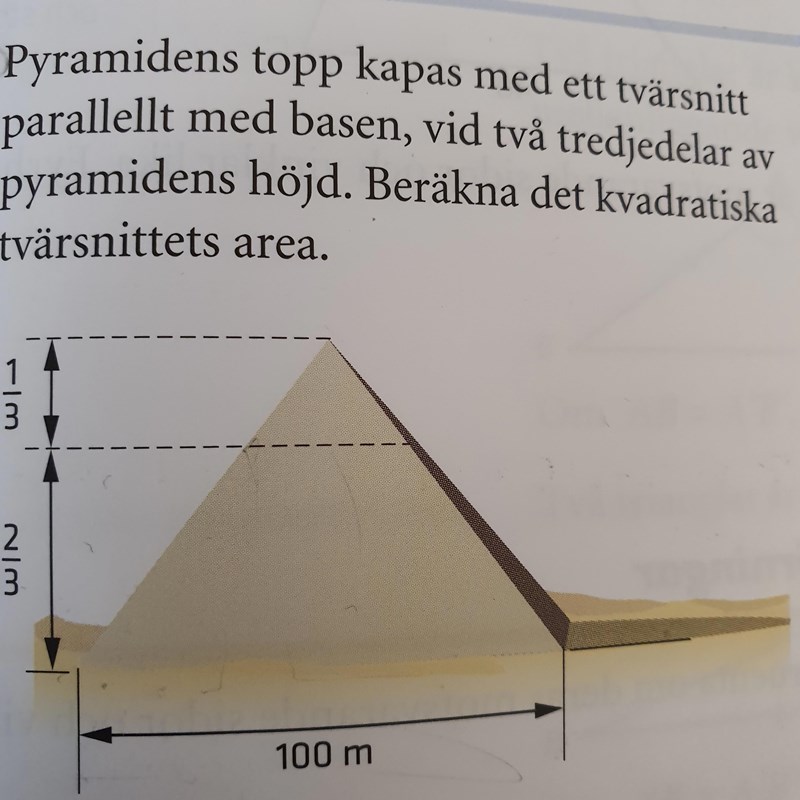 Låt x vara tvärsnittets sida. Min lärare gav uträkningen x/100 = (1/3 h )/h vilket ger x = 100/3.