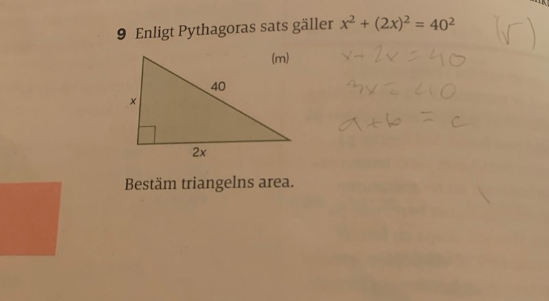 Triangelns area kan du beräkna som x*2x/2 vilket kan förenklas till