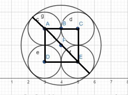Notera att den långa diagonalen som går från kant till kant genom F är en  diameter i den stora cirkeln. Går den att ta reda på hur lång den är på något sätt?