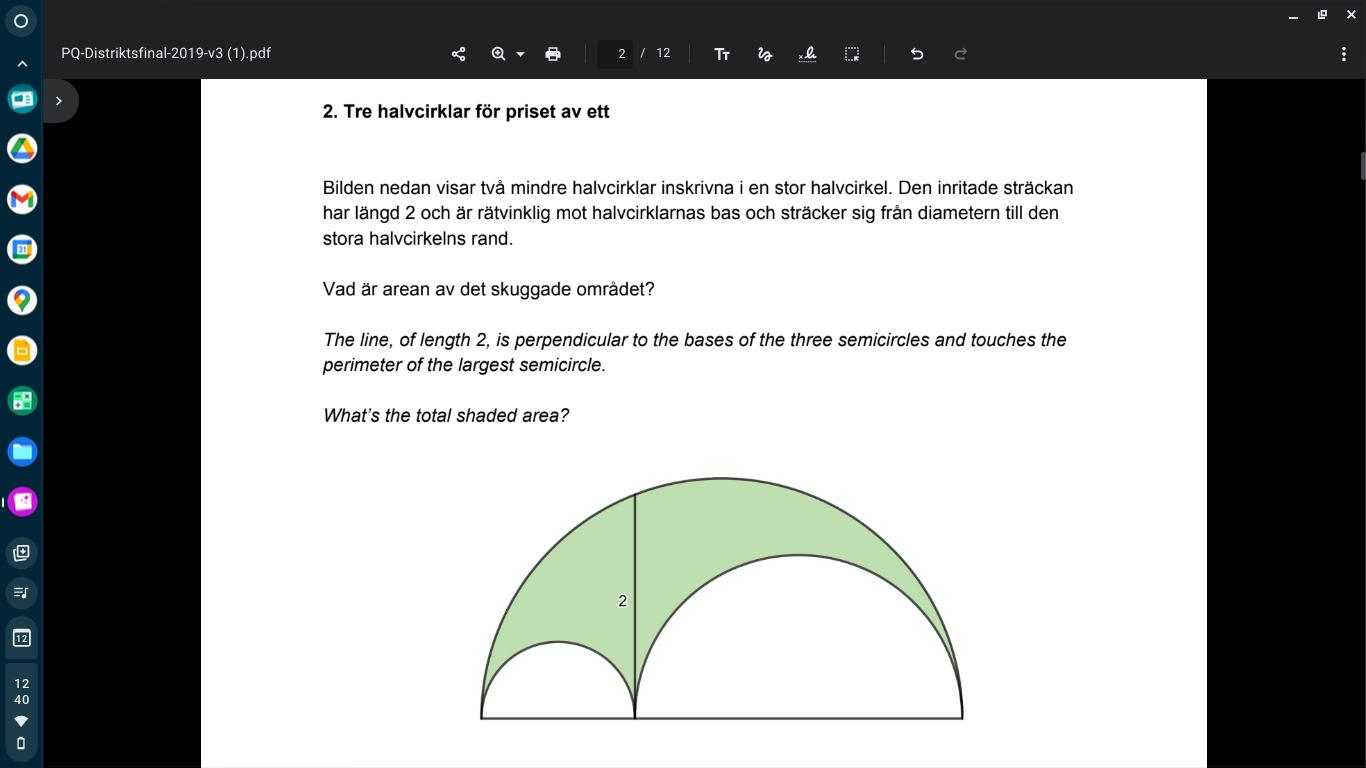 Hur löser man denna uppgift? Lyckas inte förstå eftersom sträckan 2 inte är radien av den stora halvcirkeln. Jag lyckas inte heller förstå hur stora alla halcirklar är i förhållande till varandra.
