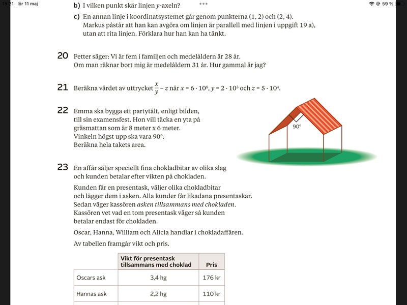 Vad behöver du för att kunna räkna ut takets area? Jo, du behöver veta arean av de två rektanglarna som bildar taket, eller hur?