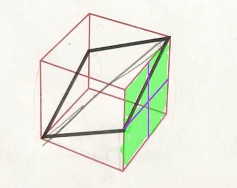 Det lila korset delar kubens sida i fyra små kvadrater.