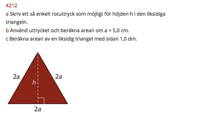 Måste ha missat nåt? Behöver hjälp med a-uppgiften. Pythagoras sats förmodar jag? Men får bara att svaret blir a. Då har jag gjort så att h^2 + a^2 = 2a^2 vilket ger h^2=2a^2-a^2, alltså att h=a om man förenklar. Svaret ska bli h=a*sqr(3). Tacksam för snabbt svar :)