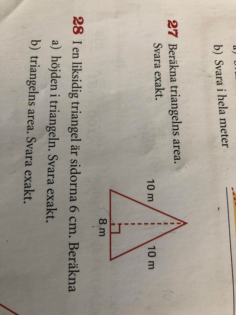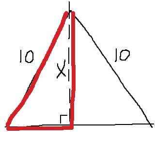 X^2+8^2=10^2 . Löser man ekvationen får man att X är 6m. Dvs höjden av triangeln är 6M.