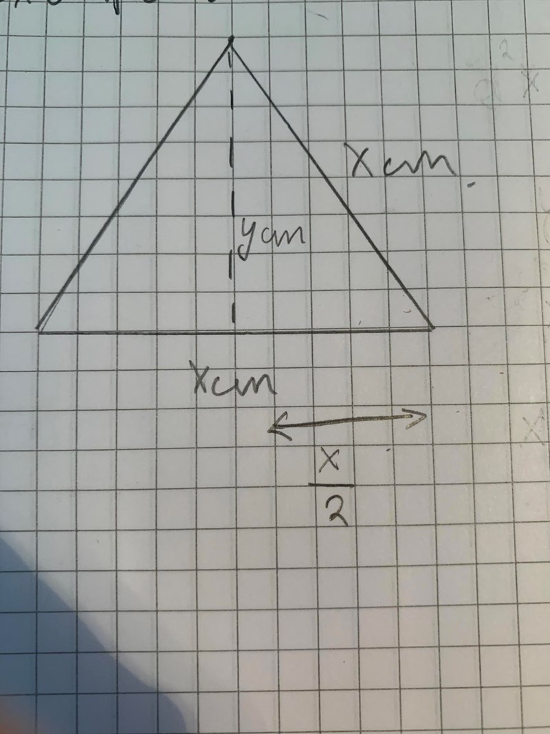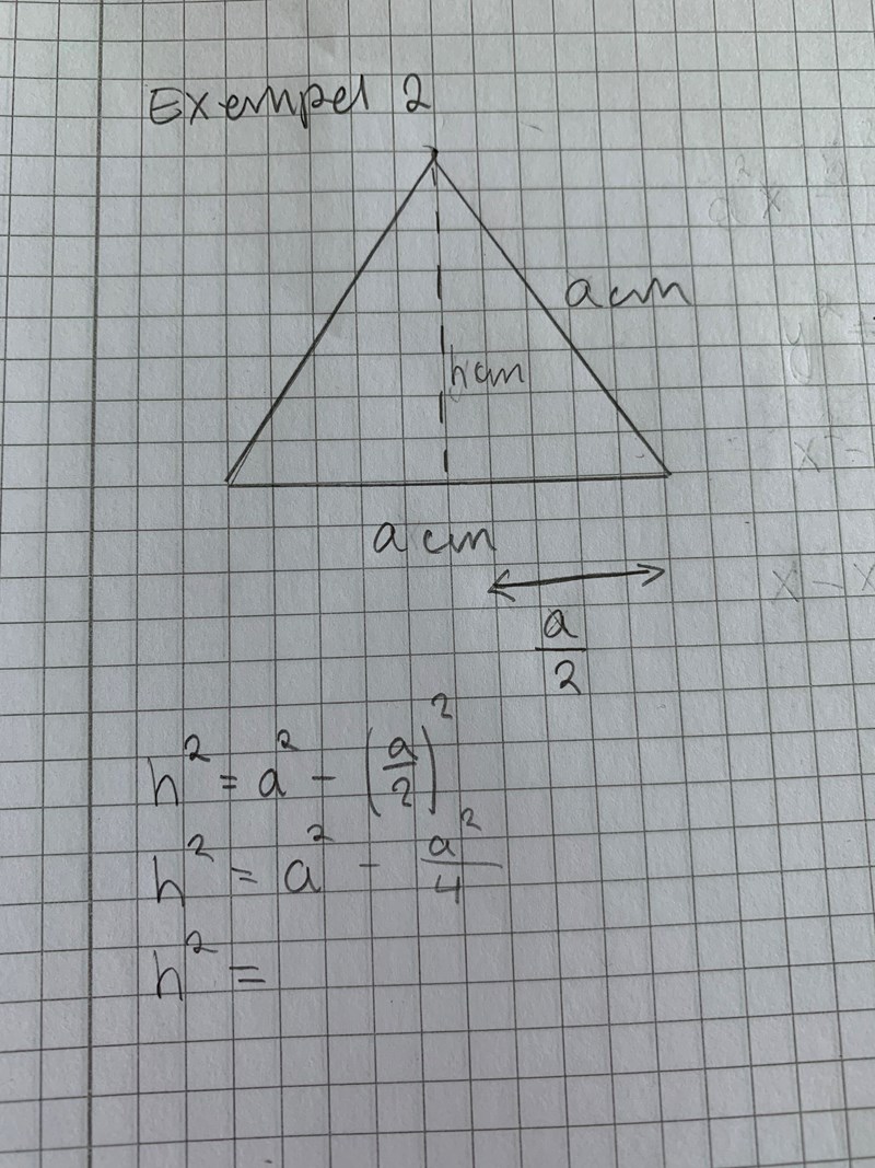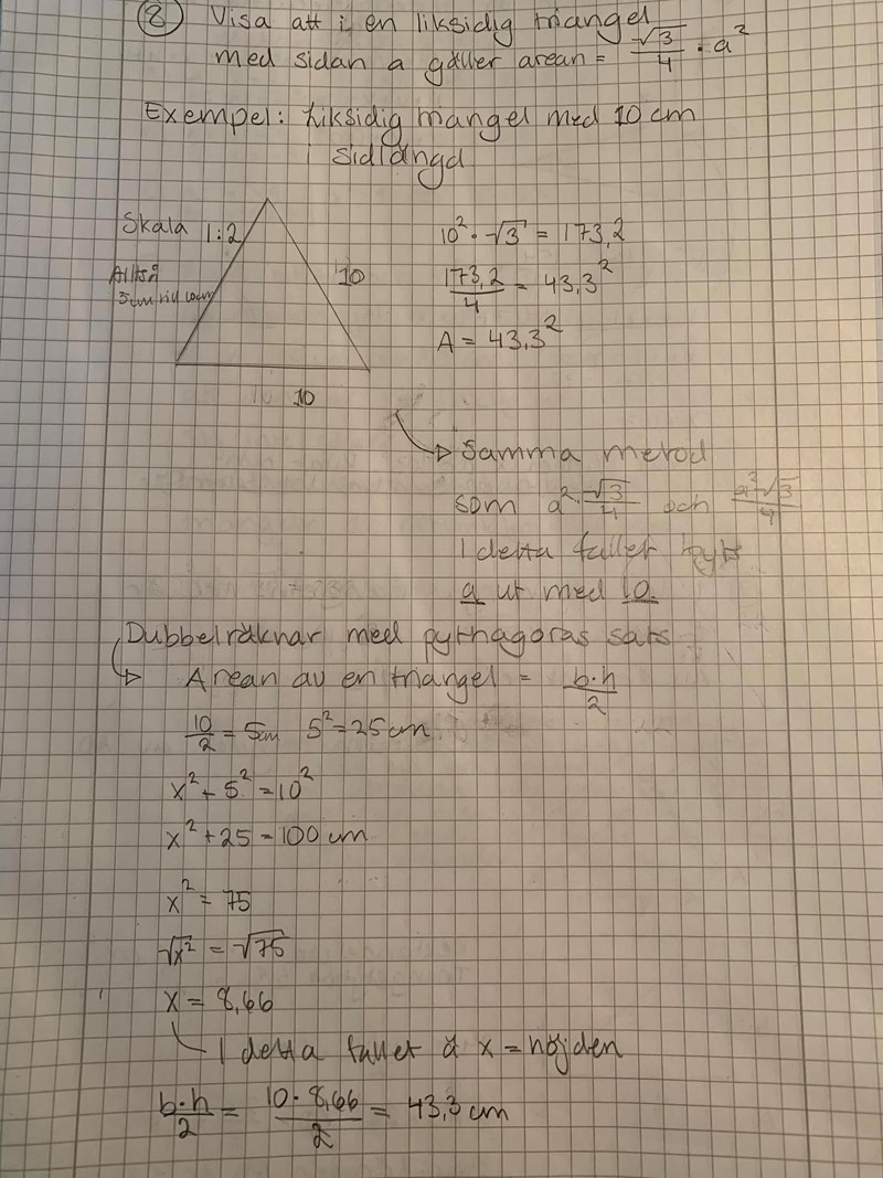 Hej, jag har kört fast... Jag ska visa ett samband, att formel x^2•roten ur 3 dividerat med 4 gäller för arean med alla liksidiga trianglar. Jag har räknat med samma metod med exempelvis 10cm. Men jag tänker att jag kan visa sambandet med att räkna ut arean genom Pythagoras sats också för att dubbelräkna och se så att svaret är korrekt. Jag har gjort det med 10cm men hur gör jag med en okänd variabel?
