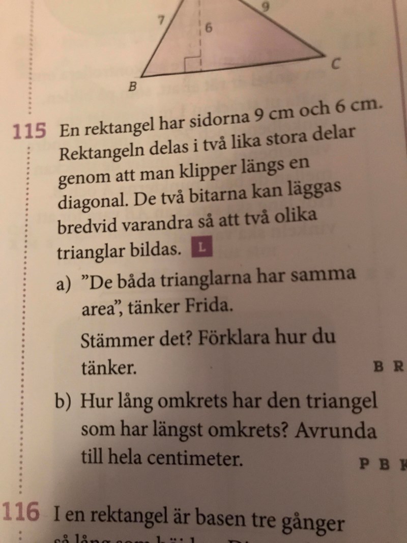Hej, skulle jag kunna få hjälp med denna uppgiften? Lyckades redan lösa uppgift a och kom fram till att båda trianglar har samma area eftersom att deras ursprungliga mått inte förändrats.