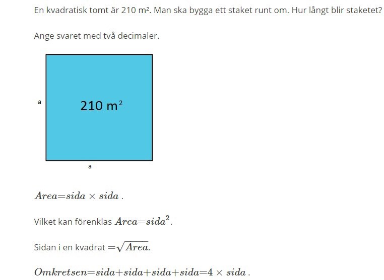 En kvadratisk tomt är 210 m². Man ska bygga ett staket runt om. Hur långt blir staketet?