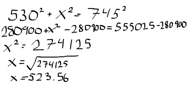 Det är dock fel eftersom du har en höjd (dvs. En katet) och en sida (ännu en katet). Du ritar hypotenusan, alltså bör du räkna 530^2 + 745^2 = x^2