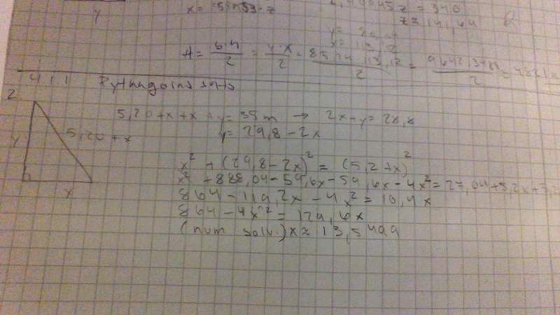 "Ett segel har formen av en rätvinklig triangel. Dess längsta sida är 5,20 meter längre än den kortaste sidan. Seglets omkrets är 35 meter.
