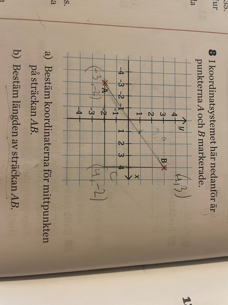 För att vi skall röra oss halva sträckan för att hitta mittpunkten, vilket i x-led blir 7 längdenheter delat på 2 och i y-led blir 5 längdenheter delat på 2.