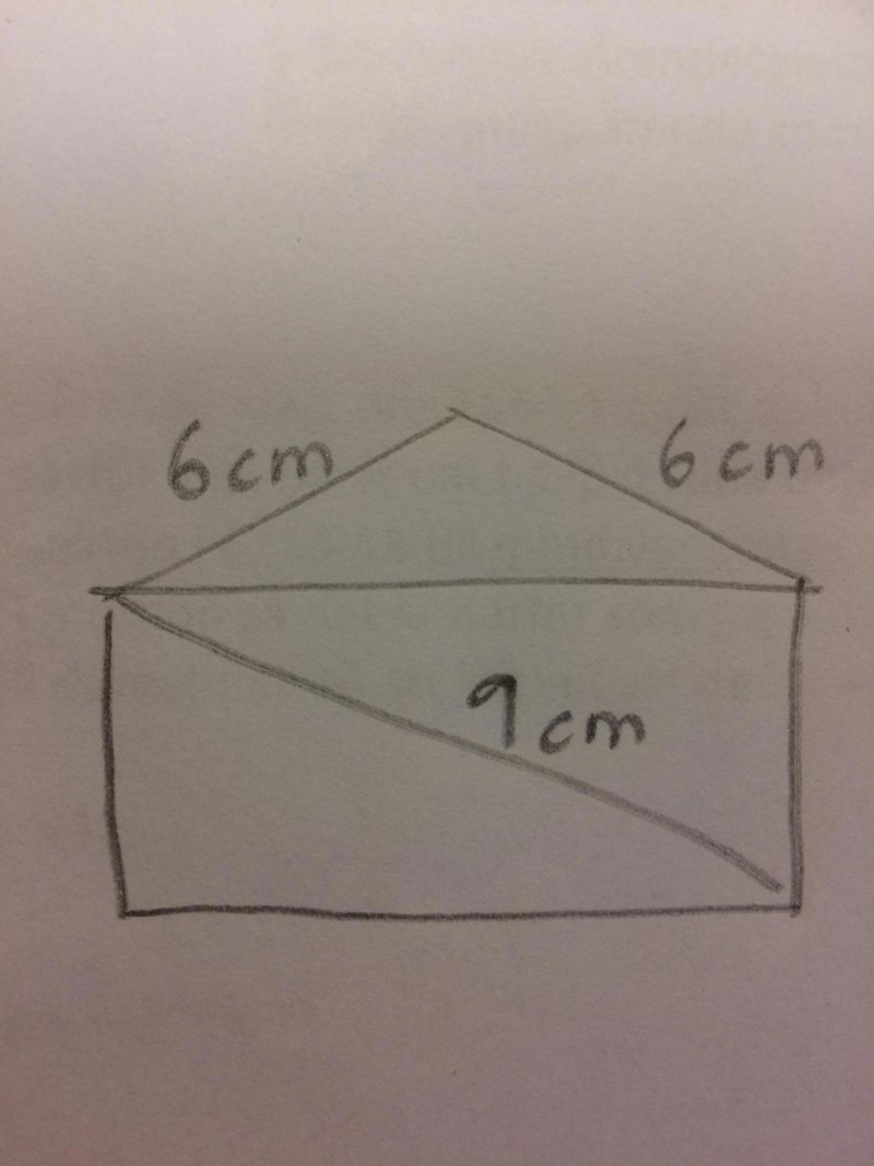 ska försöka. Den står på den långa sidan. Rektangeln "ligger" ner och har diagonalen 9 cm från övre vänstra hörnet till det nedre högra. Ovanpå rektangeln står den likbenta triangeln med sidorna 6 cm.