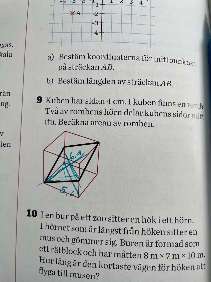 gällande uppg. 9: jag har försökt lösa den här uppgiften i typ 40 min nu. jag har räknat ut diagonalen på en kvadrat och sen tog jag den diagonalen som alltså var 5,6 så tog jag den upphöjt i 2 och det plus 4^2 och sen roten ur det vilket blev 6,9. sen tog jag 6,9*5,6/2 som blev 19,32 cm. svaret i facit är 20 cm, vad har jag gjort fel? jag har räknat ut båda rombens diagonaler