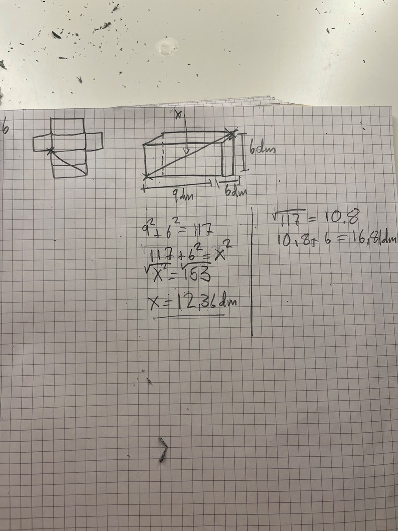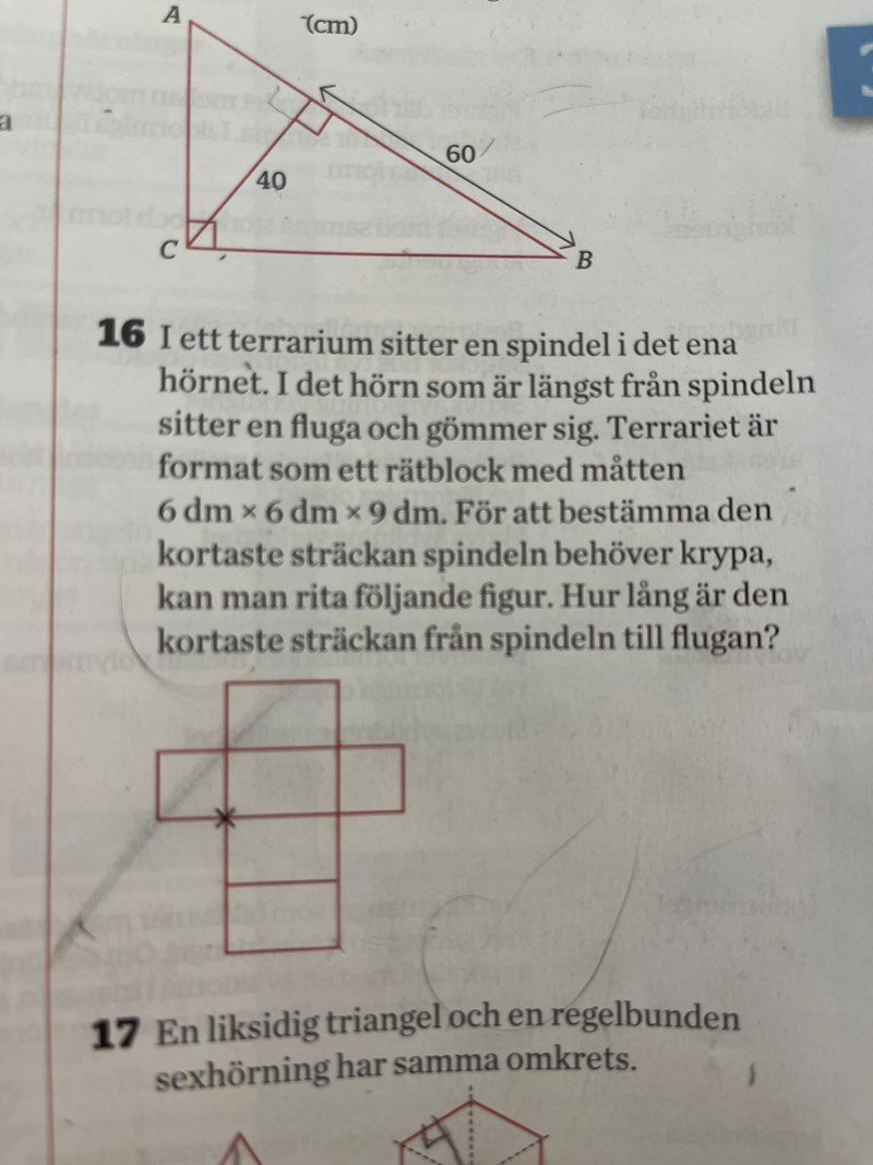 hej, jag har försökt att lösa denna uppgift på lite olik sätt. Först tänkte jag att jag skulle använda mig av rymddiagonal metoden men fick då som svar 12,36dm vilket var fel i både facit och för att spindeln inte kan flyga. Sedan tänkte jag att den kanske kunde krypa diagonalt till det högra hörnet och sedan krypa upp för väggen. Som svar fick jag då 16dm vilket också var fel. Vet inte riktigt hur jag ska göra. Svaret i facit är 15 dm.