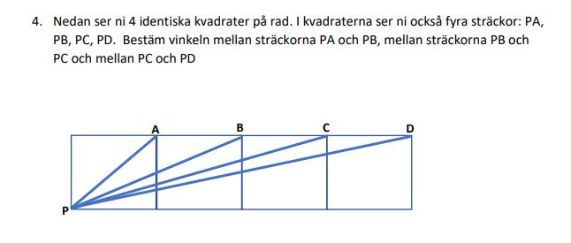 I uppgiften anges att varje rutorna är identiska kvadrater. Ibland får man räkna ut olika vinklar och sen ta skillnaden.