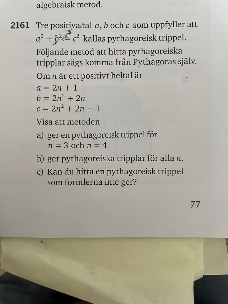 Har lite svårt att förstå c) uppgiften i den här frågan. I facit står det: Formlerna ger alltid att a är udda och att c= b+1. Exempelvis 6,8 och 10.
