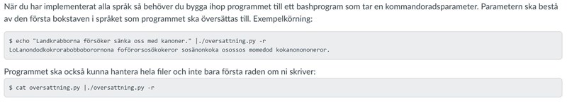 Valet av språk ska göras med hjälp av en kommandoradsparameter istället för att fråga användaren med en input(). Så, rad 15 ska ersättas med anrop till en ny funktion som du skriver och som avgör språkvalet genom att tolka kommandoradsparametern.