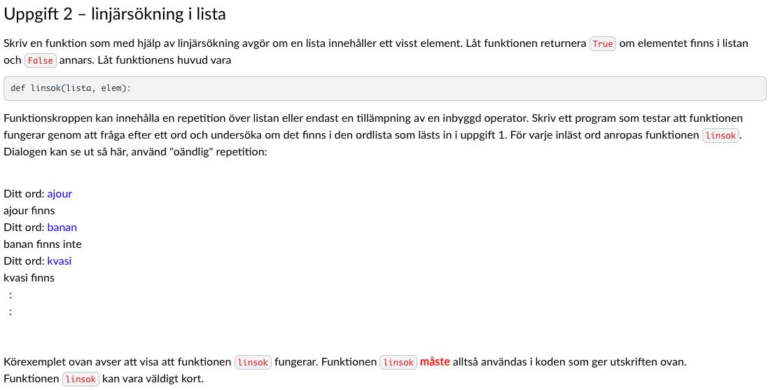 Exempelvis:def linsok(ordlista, ord): if ord in ordlista: return True else: return FalseKan skrivas som: