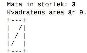 Jag är nybörjare i att programmera i Python och har fått en uppgift som går ut på attskapa ett program där användaren matar in en storlek (längd på en sida) på en kvadrat som sedan ska skrivas ut som följande. Även kvadratens area ska räknas ut. Kvadraten ska ritas ut som två rätvinkliga trianglar enligt nedan: