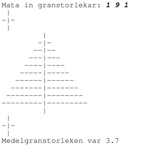 Jag ska skapa ett program där användaren ska mata in ett fritt antal olika storlekar på granar. Programmet ska då rita ut dessa granar och räkna ut medelstorleken på dem. Exempelvis: