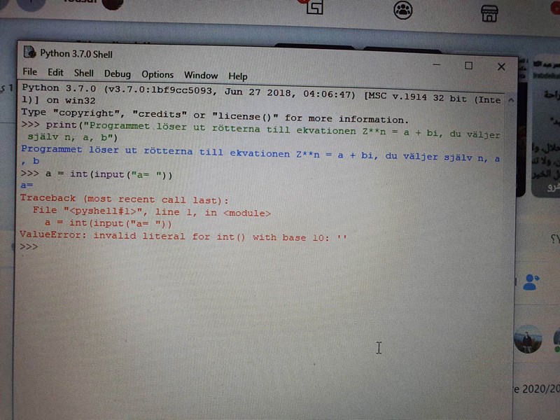Python 3.7.0 (v3.7.0:1bf9cc5093, Jun 27 2018, 04:06:47) [MSC v.1914 32 bit (Intel)] on win32 Type "copyright", "credits" or "license()" for more information. >> print("Programmet löser ut rötterna till ekvationen Z**n = a + bi, du väljer själv n, a, b")