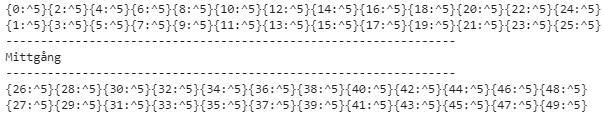 som alltså specificerar hur datan ska skrivas ut, i det här fallet med en specifikation ^5 om att texten vid varje plats ska vara centrerad och ha padding så att texten är i ett utrymme om 5 tecken.