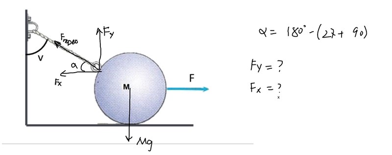 Ja jag tänker att vi kan lösa F_y om vi antar att F_x = F med hjälp av tangens. man kan ju räkna ut vinkeln V med motstående katet/närliggande katet, på samma sätt kan vi lösa ut närliggande katet genom att multiplicera V med motstående katet tänker jag. närliggande katet är F_y och motstående katet är F_x.