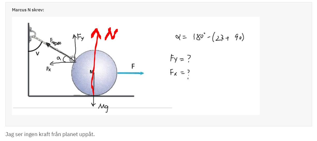 Marcus N skrev:a) Beräkna storleken på kontaktkraften på klotet från planet. Svara med 2 värdesiffror.