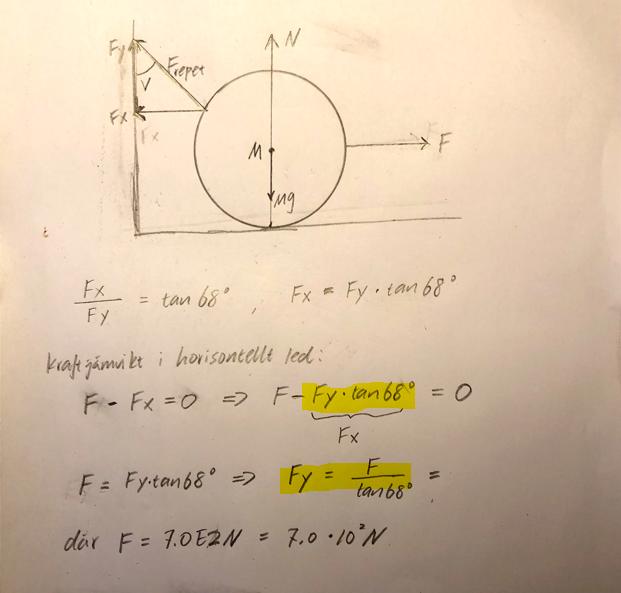 Sen tänker jag att F är lika med Fx. Och sen att vi kan beräkna Fy med hjälp av tangens:Vad tycker du om det?