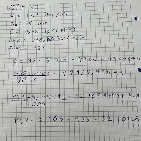 Vi ska räkna hur mycket det kostar att duscha men jag tror att svaret är ej rimligt 32 kr.