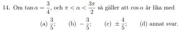Vet inte riktigt hur jag ska räkna ut vad cos a är. Gissade spontant att cos a skulle vara -(3/5) efter som vinkeln ligger i tredje kvadranten. Eftersom svaret är d) är uppenbarligen värdet på cos a fel. Tacksam för lite hjälp! Hur räknar jag ut cos a?