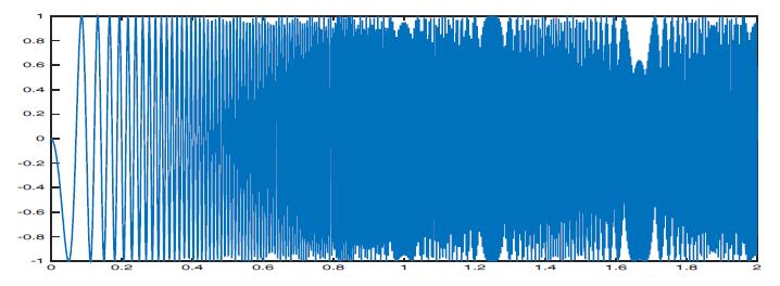 Det ser ut som insignalen börjar på låg frekvens och med tiden ökar den, ett s.k. frekvenssvep.