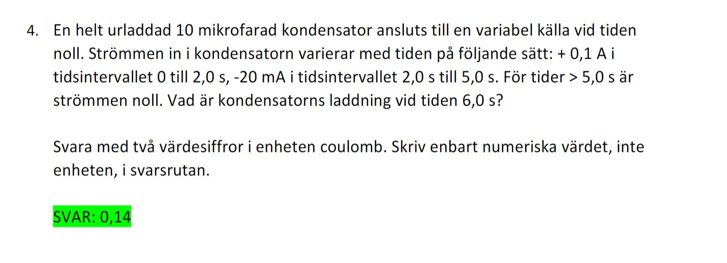 Hur ska man tänka här, ska man adderar ihop kondensatorns laddning mellan tidsintervall [0,6] ? Men den enda formeln som ja har för att räkna kondensatorns laddning är den här: .