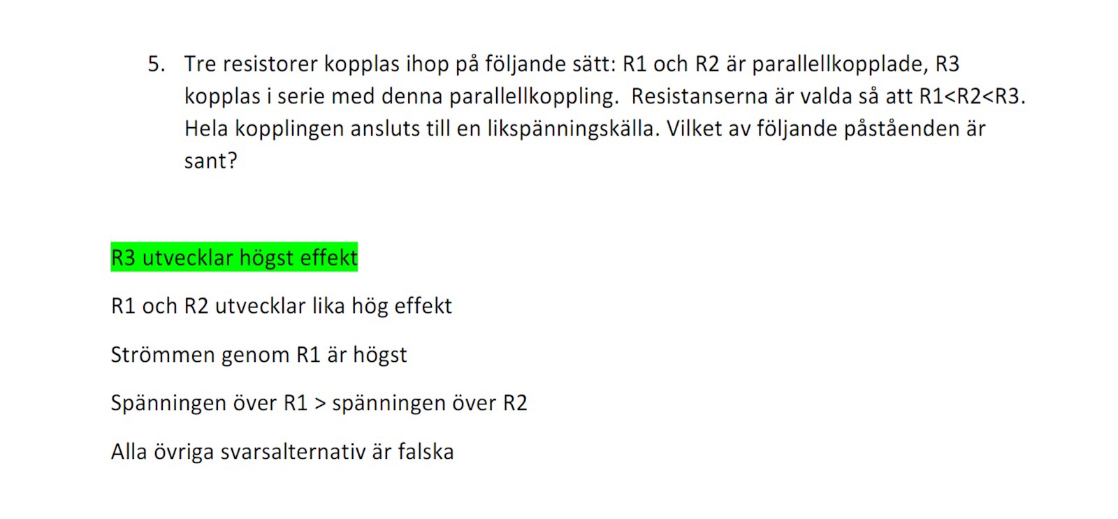 Men varför alt. "Strömmen genom R1 är högst" är också falskt? Är inte resistansen i R1 minst? Så det make sense att säga R1 gå mest strömmen igenom.