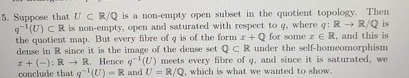 Hjälper detta dig något? Kan du nu följa din lärares resonemang? Är du med på vad lärarens bevisstrategi är? Förstår du ungefär hur ser ut? Kan du reda ut vad definitionen av kvottopologin säger i just det här fallet?